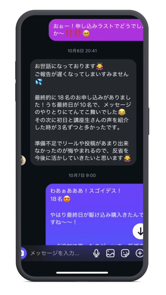 今回制作したLPを使い、インスタのストーリーを活用した10日間のプロモーションを実施。最終的に18名のお申し込みとなりました。(←インスタストーリーのみですよ!すごい!)